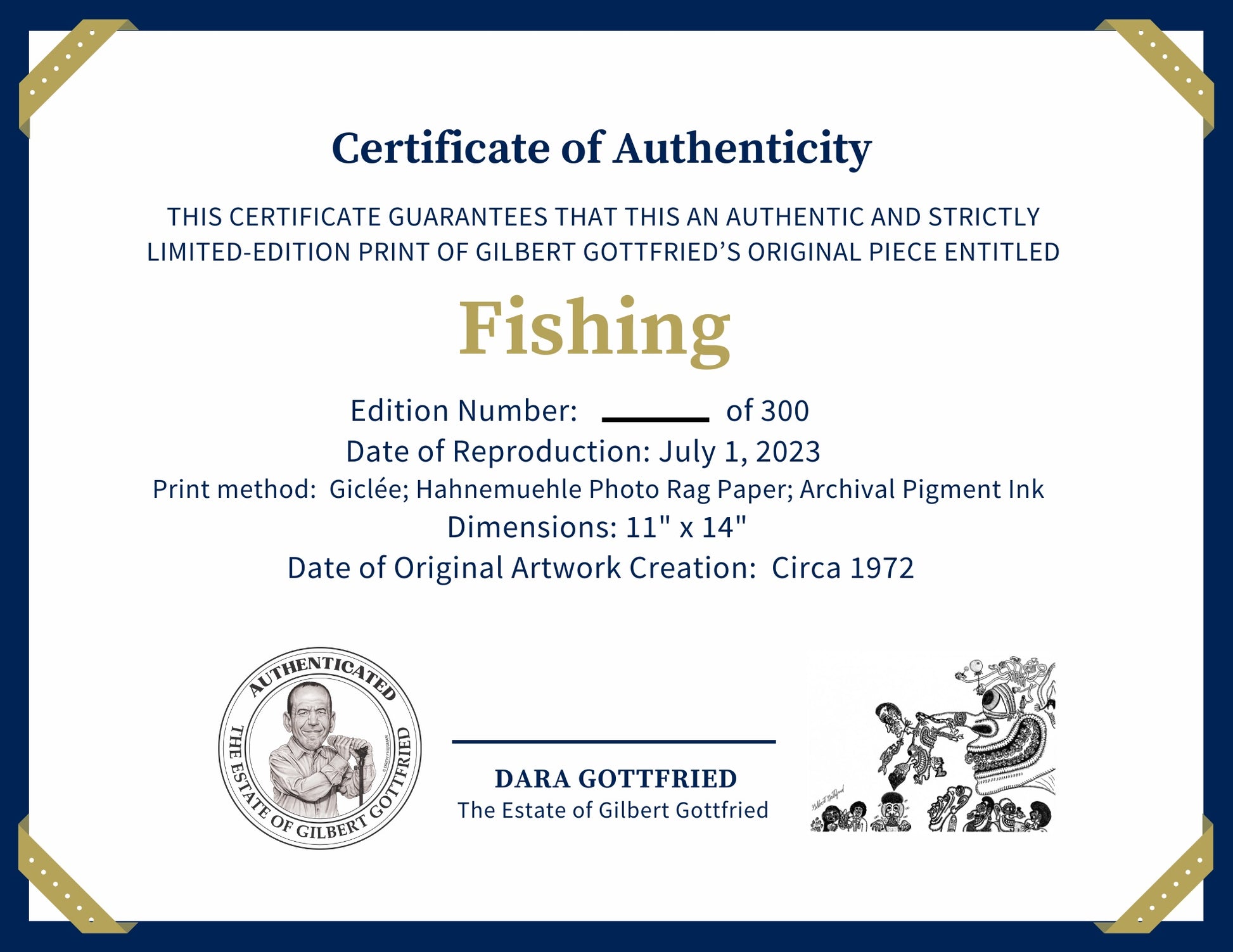 Each print is individually numbered in pencil, includes Gilbert's signature, a custom Authentication Estate Sticker on the back of the print and a Certificate of Authenticity signed and numbered by his widow, Dara Gottfried.